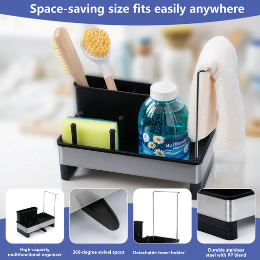 LIZEVINC Sink Caddy Organizer, Stainless Steel Kitchen Caddy with 360° Self-Drain Sponge Caddy, Removable Brush Holder, Soap & Dishcloth Storage Rack, Rustproof, Non-Slip, for Countertop Organizer