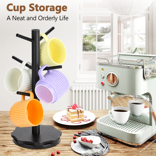 LIZEVINC Mug Holder Tree, 360° Rotating Wooden Mug Holder, 6-Hook Coffee Cup Rack for Countertop, Home Office & Non-Slip Base